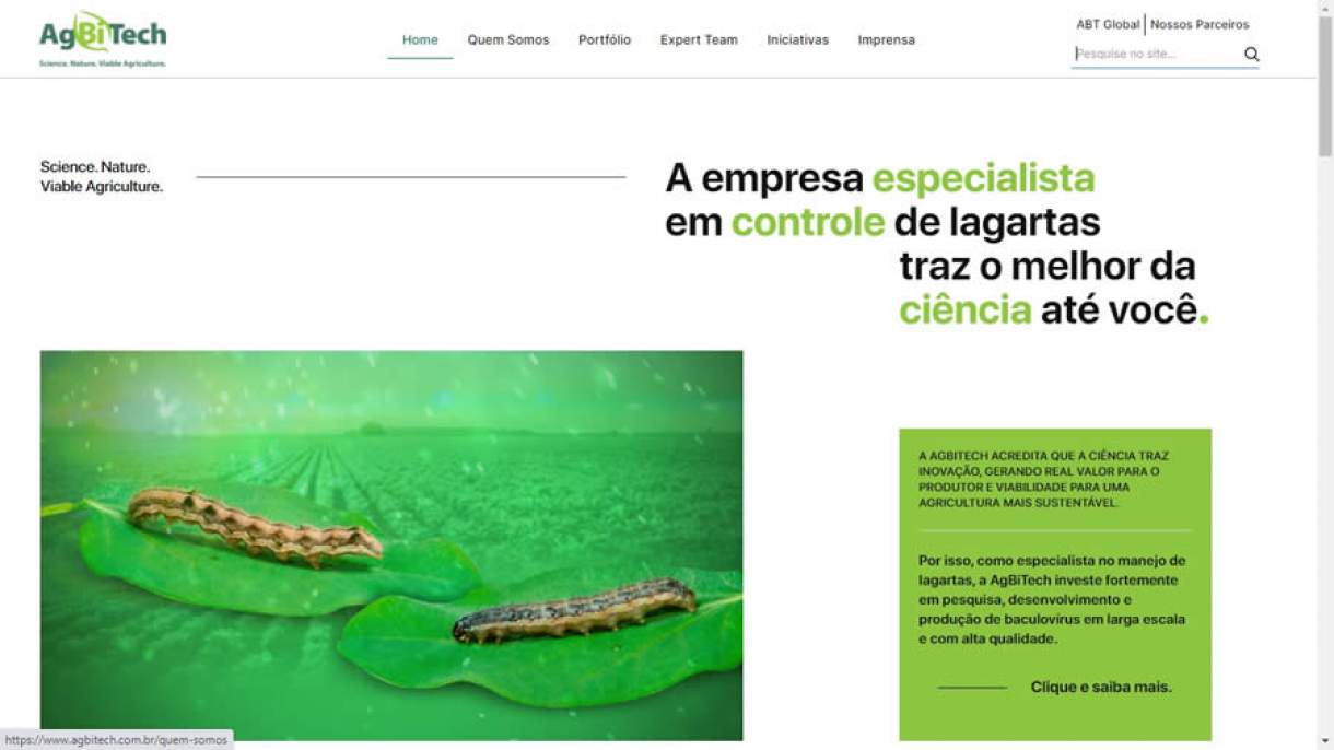 Maior fabricante de bioinseticidas à base de baculovírus do mundo, a empresa de origem australo-americana AgBiTech coloca no ar, hoje, o primeiro site do Brasil totalmente voltado ao manejo biológico de lagartas na agricultura. Com crescimento de 200% na área tratada por seu portfólio entre as safras 2017-18 e 2019-20, a AgBiTech é líder do mercado nacional de controle biológico de lagartas para algodão, além de registrar presença relevante e crescente nas culturas de soja e milho.