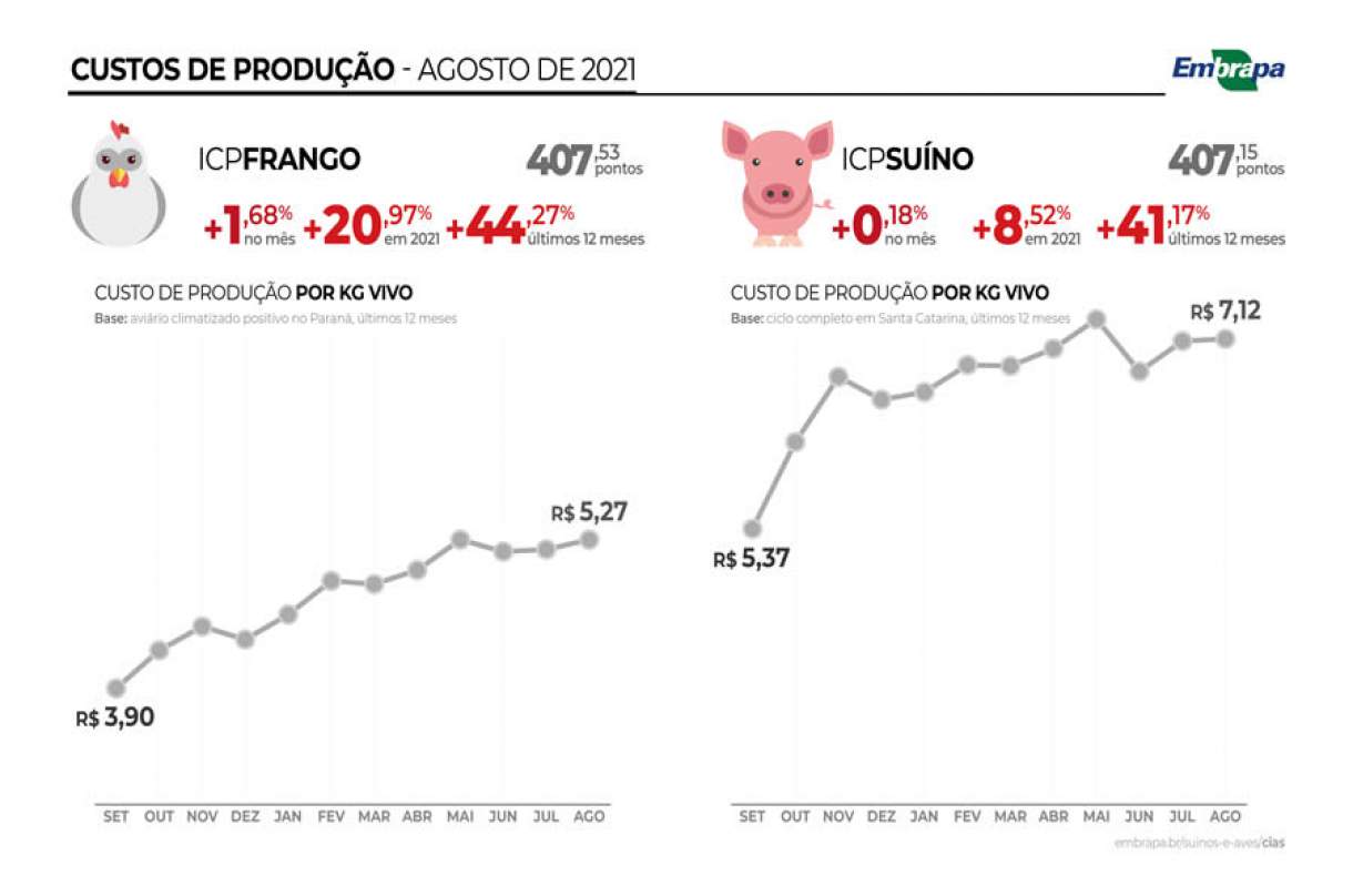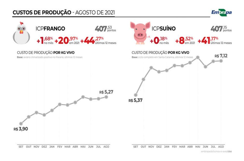 Os custos de produção de frangos de corte e de suínos registraram novo aumento durante o mês de agosto segundo os estudos publicados pela CIAS, a Central de Inteligência de Aves e Suínos da Embrapa, que disponibiliza as informações no site embrapa.br/suinos-e-aves/cias. Tanto o ICPFrango quanto o ICPSuíno voltaram a ficar acima da barreira dos 400 pontos, chegando aos 407,53 e 407,15 pontos, respectivamente.