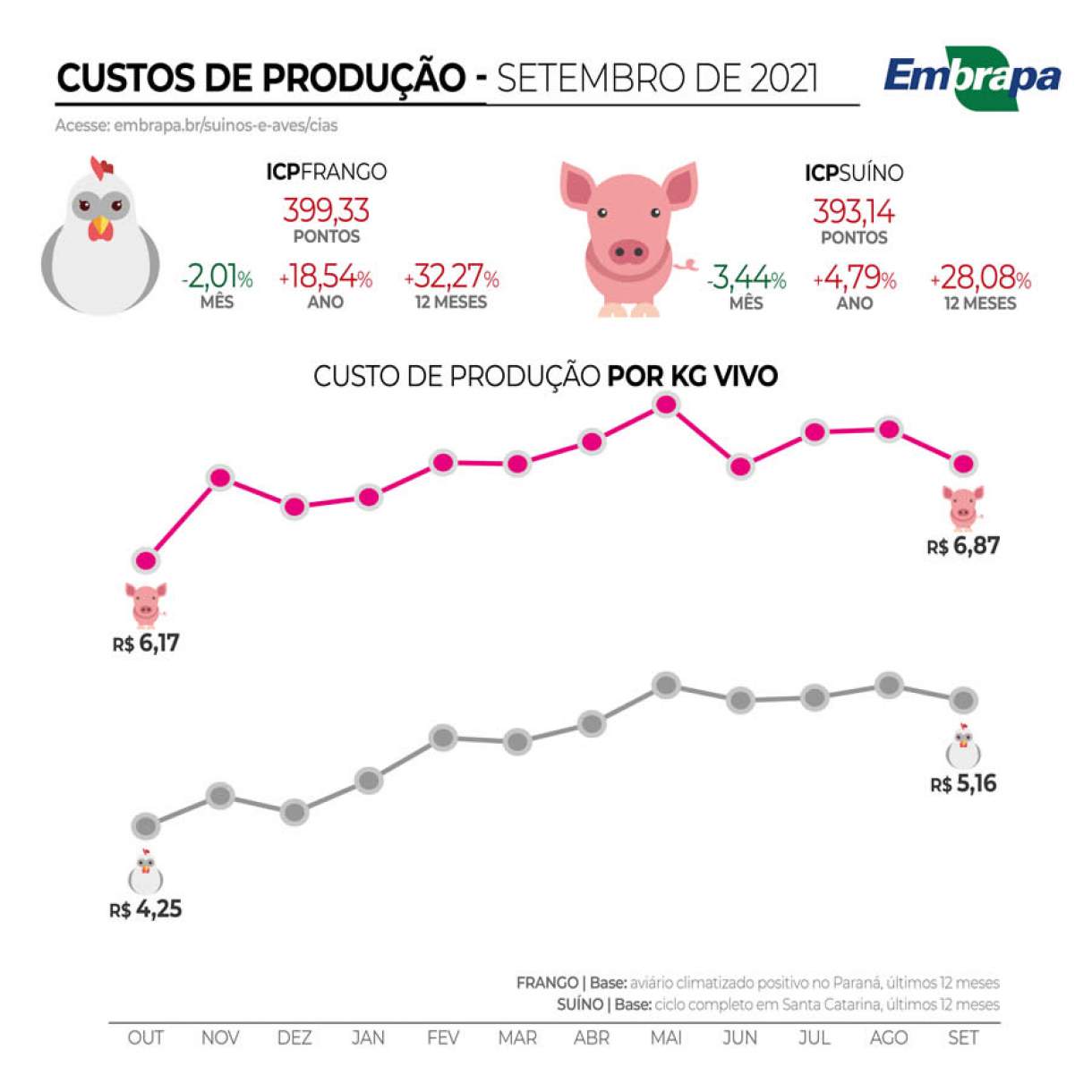 Os custos de produção de frangos de corte e de suínos tiveram uma queda no mês de setembro segundo os estudos publicados pela CIAS, a Central de Inteligência de Aves e Suínos da Embrapa, que disponibiliza as informações no site embrapa.br/suinos-e-aves/cias. Tanto o ICPFrango quanto o ICPSuíno ficaram abaixo da barreira dos 400 pontos, chegando aos 399,33 e 393,14 pontos, respectivamente.