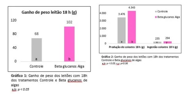 Ao avaliar o efeito dos Beta-glucanos de algas em matrizes nas fases de pré lactação e lactação, não foi observado diferença (p>0.05) no número de leitões nascidos, nascidos vivos e peso no nascimento. Contudo, foi verificado efeito sobre a produção de colostro, com maior produção nas matrizes que receberam os Beta-glucanos de algas (p0.05), possibilitando maior ingestão de colostro pelos leitões (p0.06), e consequentemente maior ganho de peso em leitões 18 horas após o parto (p0.05) demonstrados nos Gráficos 1 e 2.