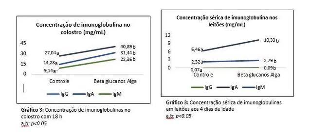 Os Beta-glucanos de algas tiveram ação também sobre a concentração de imunoglobulinas no colostro, promovendo maior produção de IgG, IgA e IgM com 18 horas após o parto, e consequentemente, aumento da concentração sérica dessas imunoglobulinas nos leitões das matrizes avaliadas aos 4 dias de idade (Gráfico 3 e 4).