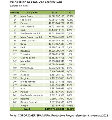 O Valor Bruto da Produção (VBP) de 2023, obtido com base nas informações de novembro, atingiu o valor recorde de R$ 1,159 trilhão, 2,5% superior em valores reais ao obtido no ano de 2022, que foi de R$ 1,131 trilhão.