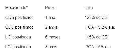 Entre as aplicações de renda fixa pós-fixadas indexadas a juros ou IPCA, estão CDBs (Certificados de Depósito Bancário) e LCIs (Letras de Crédito Imobiliário). Ao montar sua cesta de investimentos, é importante primeiro verificar o prazo da aplicação pois, quanto maior o prazo, maior costuma ser a rentabilidade oferecida. Confira na tabela abaixo as taxas do Banco Bari para diferentes prazos, com aplicações pós-fixadas indexadas a juros ou inflação;