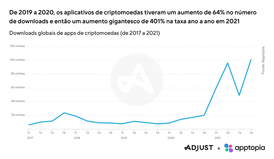 "Nossos dados mostram um aumento gigantesco na demanda por carteiras e corretoras de criptomoedas desde o ano passado. A expectativa é que os aplicativos de criptomoeda continuem crescendo junto com as moedas digitais", comenta Adam Blacker, vice-presidente de Insights na Apptopia.