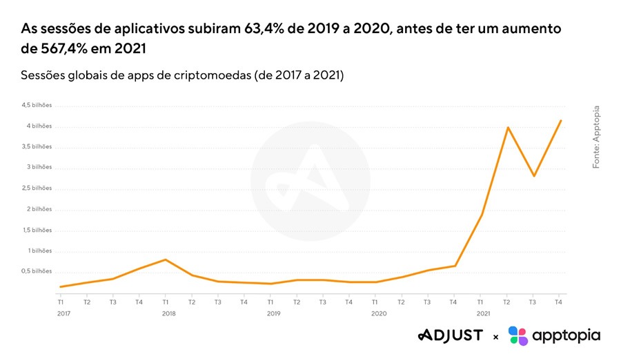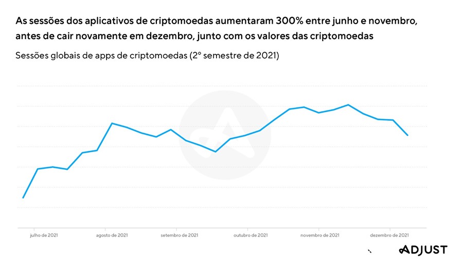 Relatório da Adjust em parceria com Apptopia também aponta que o aumento no uso de cripto apps supera o de aplicativos de negociação de ações
