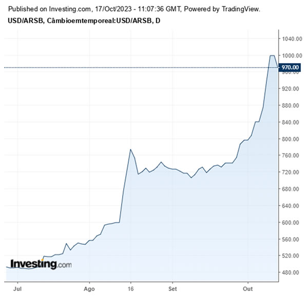A cotação subiu 61%, de 600 pesos do dia 11 de agosto (sexta-feira antes das primárias) para 970 pesos na cotação de 12/10. O dólar paralelo chegou a ser negociado a 1.000 pesos nas ruas de Buenos Aires neste mês. Além da perspectiva de vitória de Milei, que poderia sacramentar o fim do peso como moeda nacional argentina, o candidato ultraliberal já incentiva seus eleitores a buscarem proteção no dólar e se desvencilhar do peso.