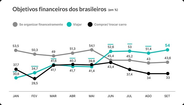 Em setembro, por exemplo, mais da metade dos 500 respondentes de Norte a Sul (54%) citaram que gostariam de fazer uma viagem até o final do ano – um aumento de 3 pontos percentuais (p.p) em relação a agosto, quando 51% disseram que essa era a próxima grande prioridade financeira.
