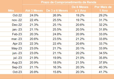 O tempo médio do comprometimento da renda com o pagamento dessas dívidas é de oito meses, o maior já registrado em oito anos. Além disso, o tempo médio das dívidas em atraso também subiu — 68,6 dias, o mais elevado desde 2019. Para se ter uma ideia, em outubro de 2023, 57,9% dos atrasos estavam superiores a 90 dias, muito acima dos 45,4% vistos um ano antes [tabela 2].