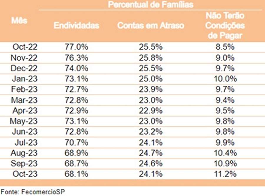 A Pesquisa de Endividamento e Inadimplência do Consumidor (PEIC), realizada pela Federação do Comércio de Bens, Serviços e Turismo do Estado de São Paulo (FecomercioSP), registrou, em outubro, um novo recorde histórico, com 452,5 mil famílias sem condições de pagar dívidas em atraso, o que representa 11,2% do total de lares da cidade de São Paulo [tabela 1].