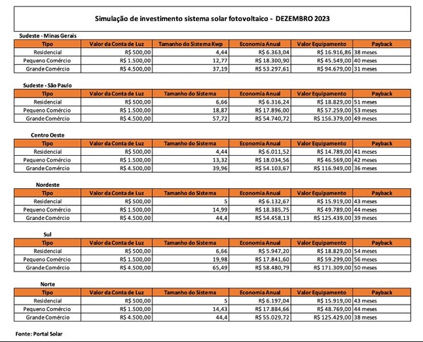 Segundo simulações na tabela de preço do Portal Solar, uma residência no Brasil que gasta uma média de R$ 500 na conta luz mensal, a instalação de energia solar no telhado ficaria em torno de R$ 15 mil e com um payback da ordem de 45 meses. O preço final varia de acordo com a região onde o painel solar será instalado (veja tabela completa abaixo).