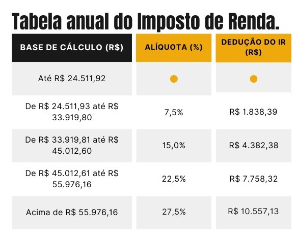 Devido à atualização realizada no meio do ano passado, houve reflexos na tabela anual do Imposto de Renda. A tabela abaixo mostra os valores atualizados: