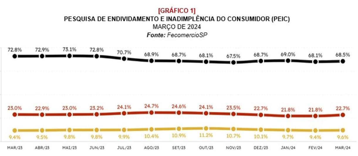 Os fatores que compõem esse fenômeno também se elevaram na análise quantitativa: o cartão de crédito, que endividava 85,8% das casas paulistanas, em fevereiro, agora o faz em 86,1% desses lares. O crédito pessoal, por sua vez, passou de 15,6% para 16,6%, enquanto o crédito consignado apontou aumento mais significativo: de 7,7% para 9%. Na percepção da Federação, esses dados sugerem que há uma demanda mais aquecida das famílias por recursos utilizados, posteriormente, para manter o consumo cotidiano, como alimentos e combustíveis. É assim que um dos principais motivos para o aumento da inadimplência em março, após meses de queda, foi justamente a inflação mais forte nesses dois grupos de produtos.