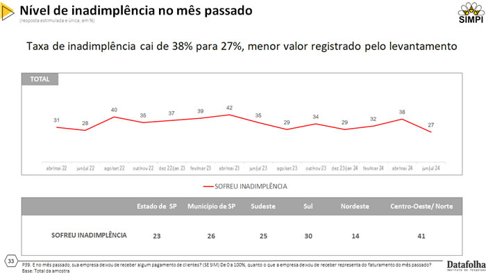 Assim como o número de procura a crédito diminuiu, a taxa de inadimplência de clientes das MPI’s também teve uma queda. Os dados saíram de 38% no último bimestre para 27%, esse é o menor resultado já registrado pela pesquisa. No entanto, com 41% das MPI’s sofrendo inadimplência, o Centro-Oeste/Norte é a região mais afetada. Das 27% MPI’s que sofrem inadimplência, 13% afirmam que o valor corresponde a mais de 30% do faturamento mensal.
