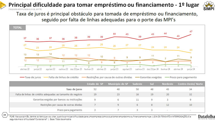 Em relação às principais dificuldades das MPI’s em conseguir crédito, a taxa de juros segue sendo o maior obstáculo com 47%, sendo esse o maior valor já registrado pela pesquisa. Em regiões, o Estado de São Paulo é o mais insatisfeito com as taxas de juros com 52% das MPI’s.