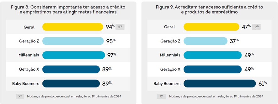 Entretanto, há disparidade significativa entre aqueles que consideram importante ter acesso ao crédito e aqueles que realmente o têm. Apenas 47% dos consumidores consideram ter acesso suficiente ao crédito. A Geração Z é a que demonstra maior insatisfação, com apenas 37% afirmando ter acesso suficiente ao crédito e a empréstimos. Na sequência, 49% de Millennials e pessoas da Geração X acreditam ter acesso suficiente a produtos de crédito.
