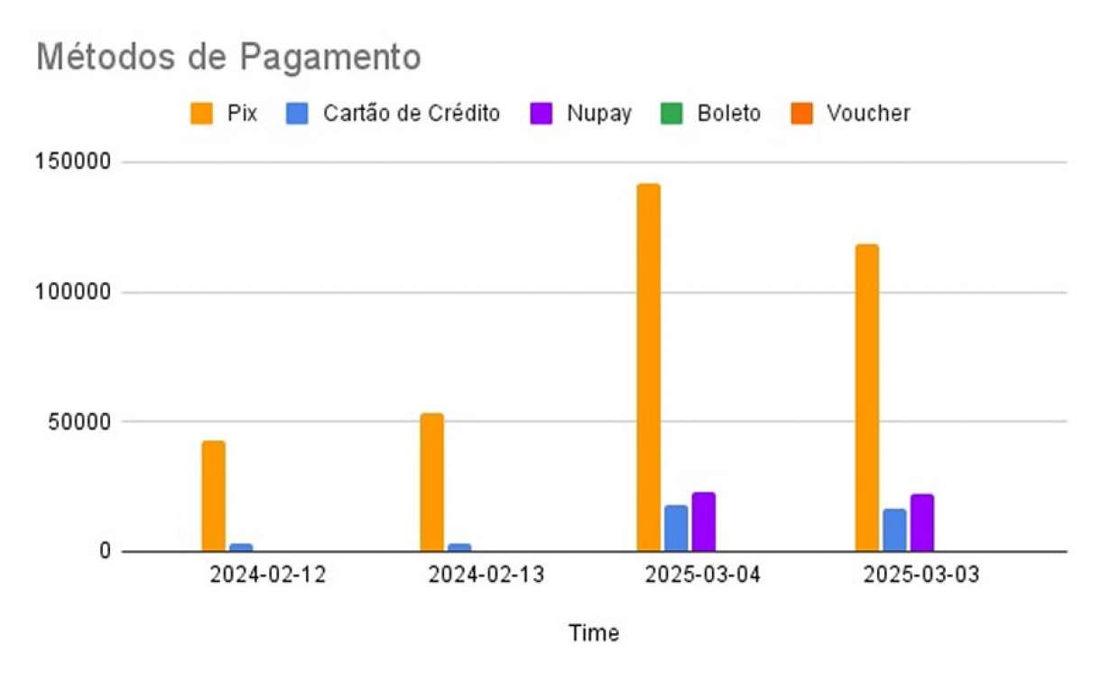 No ranking, o NuPay representou 12,50% das escolhas do consumidor, seguido de 9,92% com o cartão de crédito e 0,28% por boleto. Os números têm como referência a segunda-feira de Carnaval (3/3), data que comparada a outras segundas regulares mostrou um pico de vendas no e-commerce (veja no gráfico abaixo).
