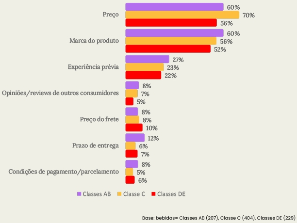 Na classe DE, o preço é importante para 56% e a marca relevante para 52%. "Novamente vemos a classe DE disposta a pagar mais para ter um produto de melhor qualidade, já que, com a renda limitada, ela não pode fazer uma nova compra para substituir uma decisão equivocada.” Entre os consumidores da classe C, o preço se destaca como o principal critério, sendo determinante para 70% deles, enquanto a marca da bebida também exerce influência para 56% dos entrevistados. Os consumidores das classes AB, por sua vez, consideram tanto o preço quanto a marca das bebidas igualmente importantes, com 60% dos entrevistados mencionando esses fatores.