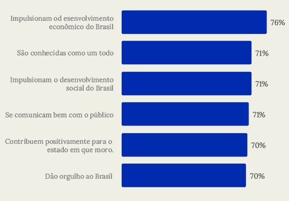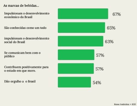 No setor de bebidas, a pesquisa indica que as marcas precisam fortalecer sua imagem. Cerca de 67% dos brasileiros acreditam que as marcas de bebidas impulsionam o desenvolvimento econômico, ante 76% das marcas de alimentos. Cerca de 57% dos brasileiros concordam que elas contribuem positivamente para o estado em que vivem - em alimentos esse número é de 70%.