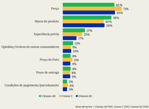 Para 62% dos consumidores da classe AB, o preço é o fator de decisão na hora da compra. No entanto, esses consumidores também consideram a escolha da marca, com 58% dos entrevistados destacando esse ponto. “O comportamento está relacionado ao maior poder aquisitivo, que permite escolher produtos associados a status e qualidade", afirma Mattar.