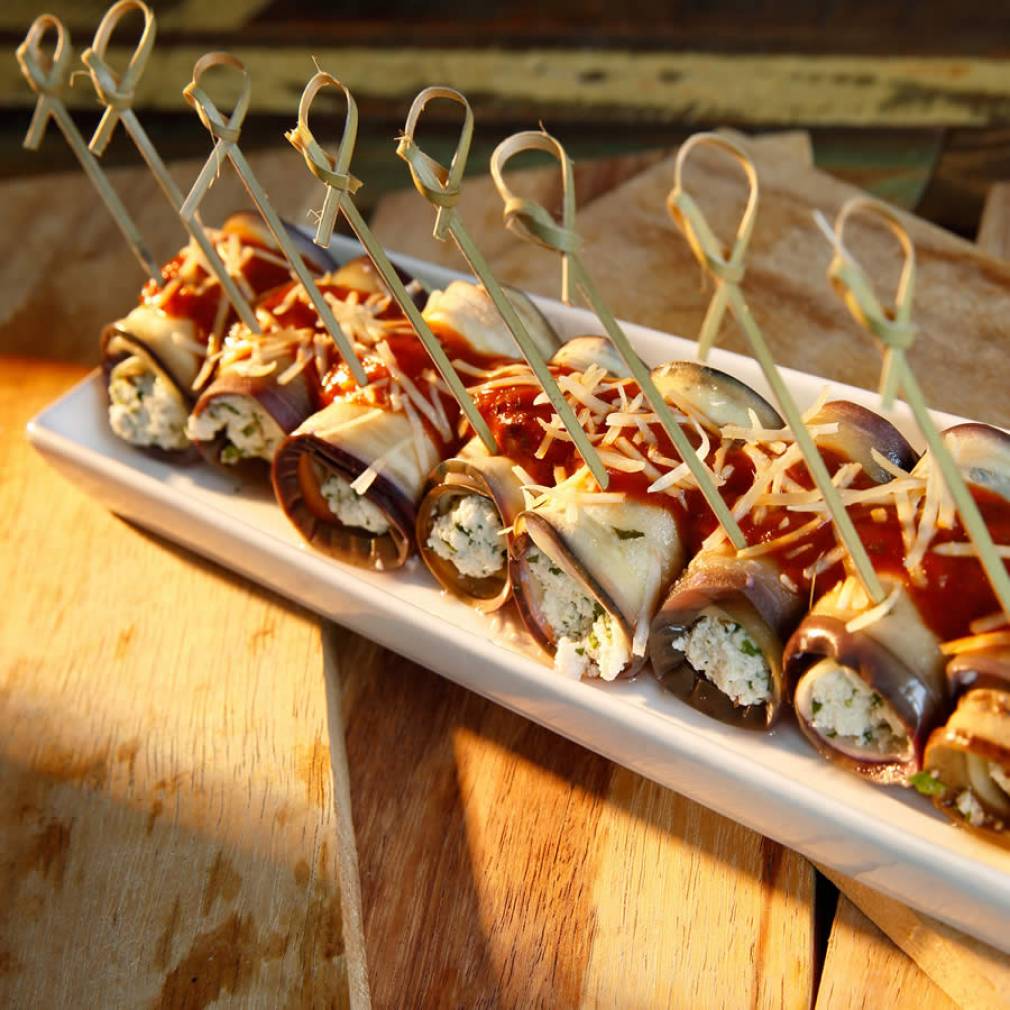 Espalhe as fatias de berinjela em uma superfície lisa e distribua o recheio. Enrole as fatias como um canelone e disponha em uma assadeira de 23cm x 23cm. Despeje o molho sobre os rolinhos, cubra a assadeira com papel-alumínio e leve ao forno por 25 minutos. Elimine o papel-alumínio e deixe no forno por mais 10 minutos, ou até dourar. Retire do forno e sirva em seguida.