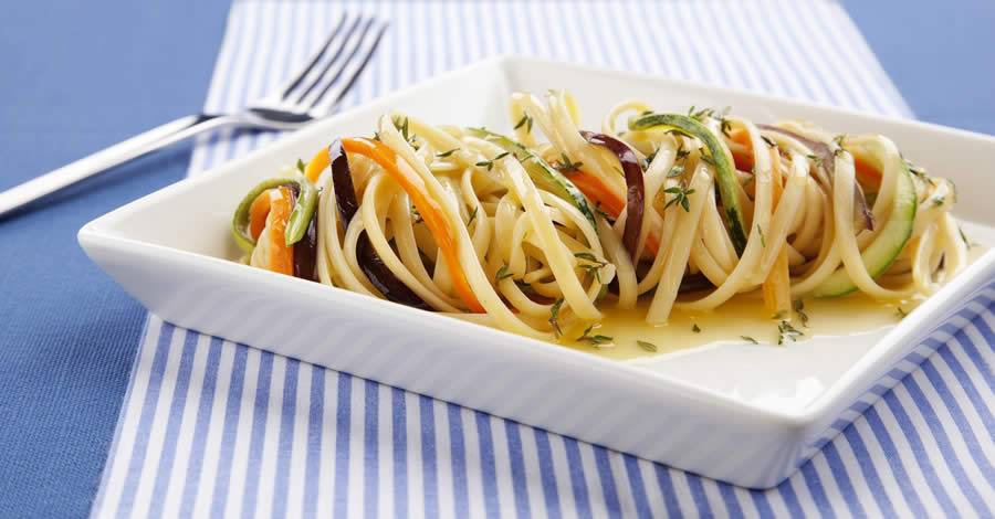 Massa: Em uma panela, leve água com sal para ferver. Acrescente o talharim e cozinhe até o ponto de “al dente”. Retire da água e reserve. Em frigideira com revestimento anti-aderente, coloque a Margarina Delícia Supreme e, em seguida, o alho para dourar. Junte os legumes, colocando primeiro as cenouras, depois as berinjelas e as abobrinhas. Saltei-os por alguns minutos (até que fiquem ligeiramente cozidos por fora mas firmes por dentro). Tempere a gosto, junte a massa cozida, misture bem e decore com folhinhas de tomilho.