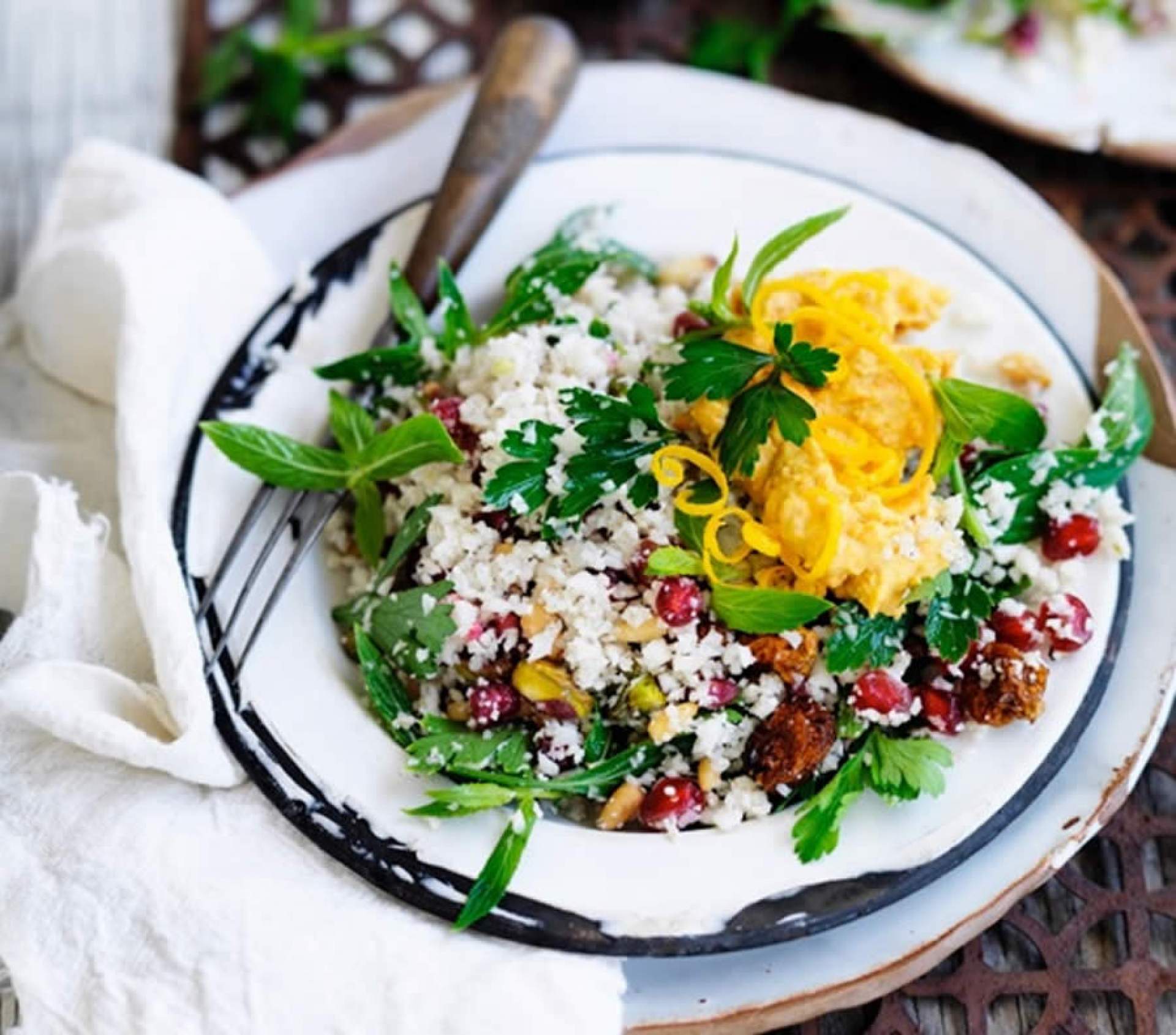 Em uma tigela grande, misture a couve-flor refogada, o pistache, os pignoli, as sementes de romã, a salsinha, a hortelã, as physalis e a casca de limão. Sirva com o homus e o limão.