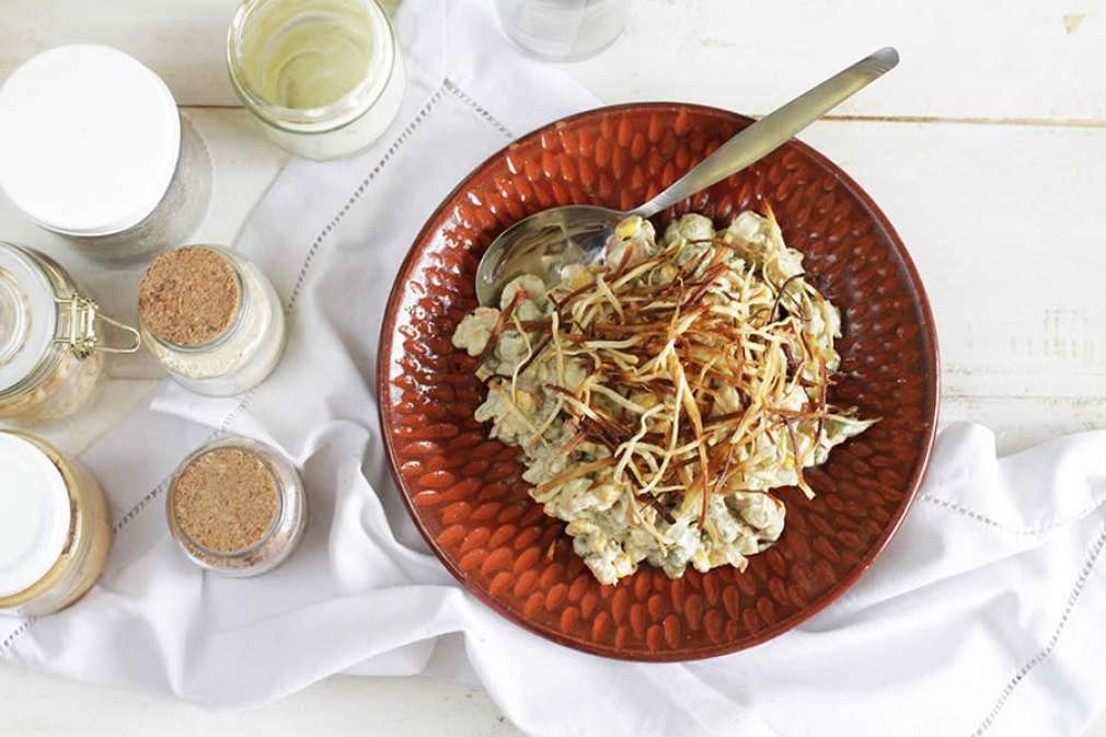 DICA DA CHEF: Caso você não queira goji berries e prefira consumir produtos locais, pode usar as frutas secas que preferir. Também deixe para acrescentar a mandioca palha somente quando for servir pra evitar que ela umedeça e perca a crocância.