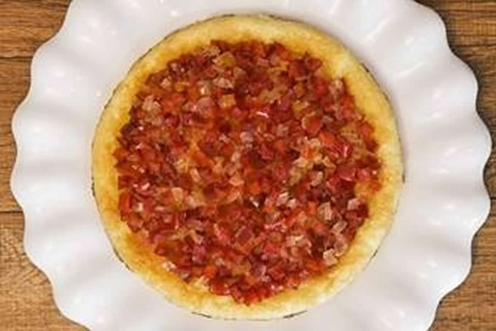 Para a geleia agridoce de pimentão, refogue a cebola no azeite e quando murchar polvilhe o açúcar e mexa. Adicione o pimentão e deixe mais 2 minutos. Regue com o vinho branco e tempere com o sal. Deixe apurar por mais 5 minutos. Coloque a geleia sobre a massa de queijos.