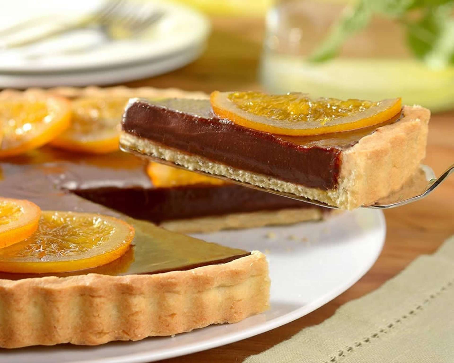 Faça a calda: Em uma panela pequena, ferva o açúcar com a água. Desligue o fogo e embeba as fatias de laranja na calda. Deixe descansar por 1 hora. Faça a massa: Coloque em uma tigela a farinha de trigo, o açúcar, o sal e a manteiga. Misture bem os ingredientes com as mãos até formar uma farofa. Acrescente o ovo e misture mais um pouco, até obter uma massa macia e homogênea, evitando trabalhá-la demais. Cubra-a com filme plástico e deixe em geladeira por 30 minutos. Abra a massa com a ajuda de um rolo entre dois sacos plásticos, até atingir a espessura de 3 milímetros. Retire o saco plástico de cima e vire a massa dentro de uma forma canelada de 25 cm de diâmetro. Retire o segundo saco plástico e ajuste a massa na forma com a ponta dos dedos. Faça furos na massa com a ajuda de um garfo. Leve novamente para a geladeira por mais 10 minutos. Coloque no molde, por cima da massa, uma folha de papel manteiga, cobrindo o fundo e as laterais. Asse em forno pré-aquecido a 180oC por cerca de 15 minutos ou até a massa começar a dourar levemente nas bordas. Retire o papel manteiga e asse por mais cerca de 15 minutos, até dourar. Retire a massa do forno, deixe-a esfriar e a desmolde. Faça o creme: em uma vasilha, bata ligeiramente as gemas com o açúcar. Enquanto isso, ferva o leite e a essência de baunilha. Despeje aos poucos o leite fervido sobre a mistura de gema e açúcar, mexendo vigorosamente a cada adição. Após despejar todo o leite, volte a mistura novamente para a panela. Cozinhe em fogo baixo, mexendo sempre por cerca de 5 minutos sem deixar ferver. Para saber se está no ponto, mergulhe uma colher no creme e faça uma linha sobre as costas da colher com o dedo. Se a linha permanecer, o creme está no ponto correto (nappé). Coloque o Unique 53% dentro de uma tigela e despeje sobre ele o creme ainda quente. Deixe por cerca de 3 minutos e então mexa vigorosamente com um batedor de arame (fouet) até obter um creme brilhante. Despeje o creme sobre a massa de torta e arrume-o com a ajuda de uma espátula. Retire as rodelas de laranja da calda de açúcar e use-as na decoração. Deixe a torta em geladeira por pelo menos 3 horas antes de servir, para adquirir consistência.