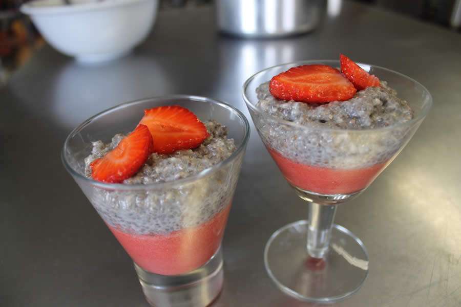 - Misture a chia com o leite de coco e o mel. Mexa bem para não formar grumos. Deixe descansando por aproximadamente 1 hora. Após a chia hidratar, misture até ficar firme.