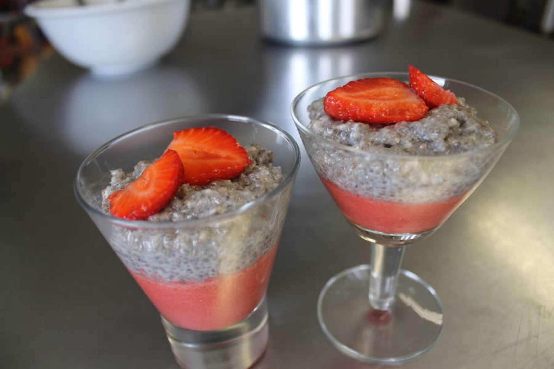 - Após a gelatina endurecer, complete o copo ou a forma com a mistura de chia e leite de coco. Leve novamente à geladeira para endurecer;