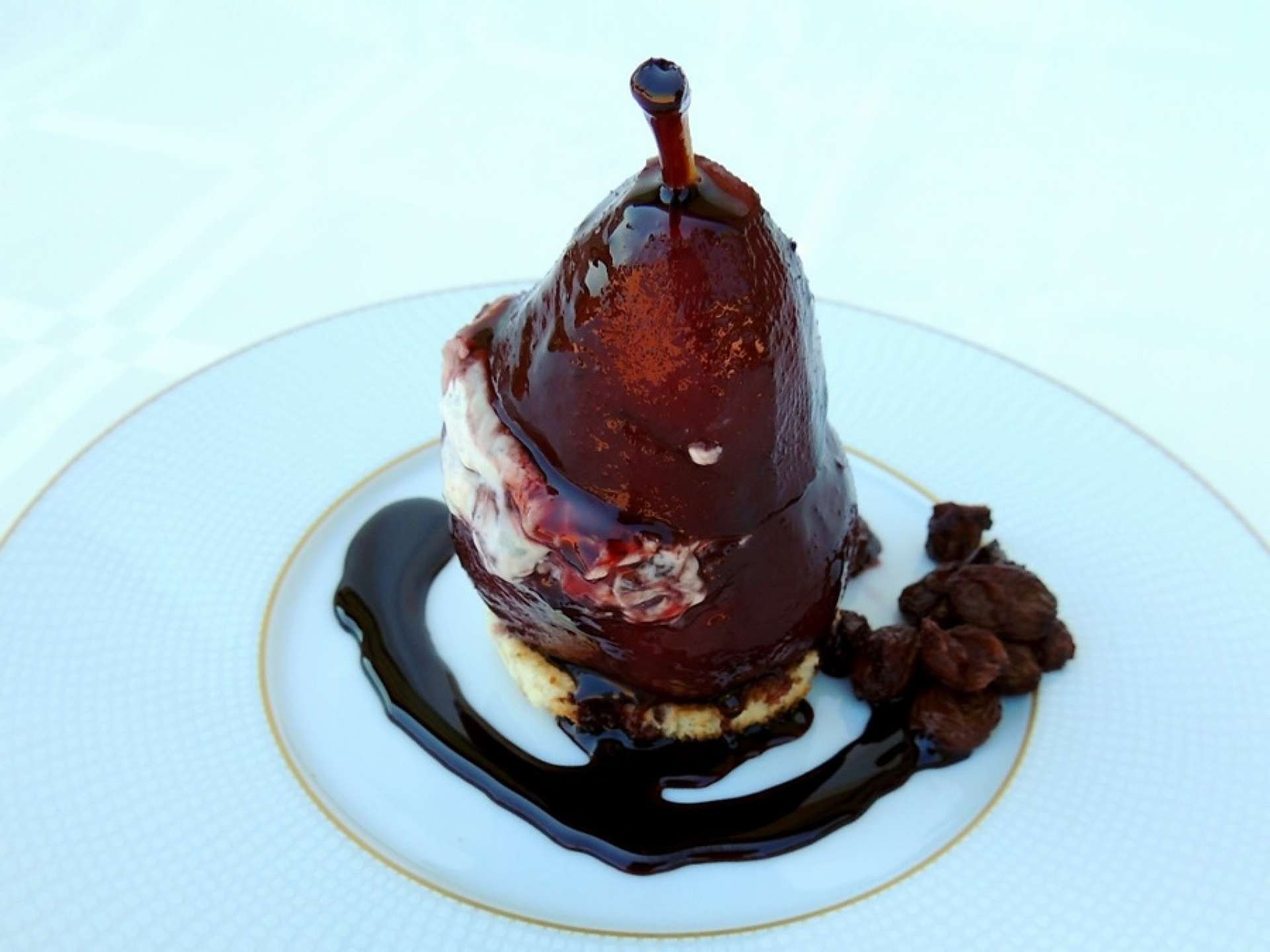Retirar as peras do vinho. Leve à fervura o vinho para fazer uma "redução" acrescentando o açúcar até obter um ponto de calda (Fio Fino). Corte as peras a 1/3 da sua altura. Com a ajuda de uma colher pequena, esvazie-os sem perfurá-los, para eliminar o coração e as sementes.