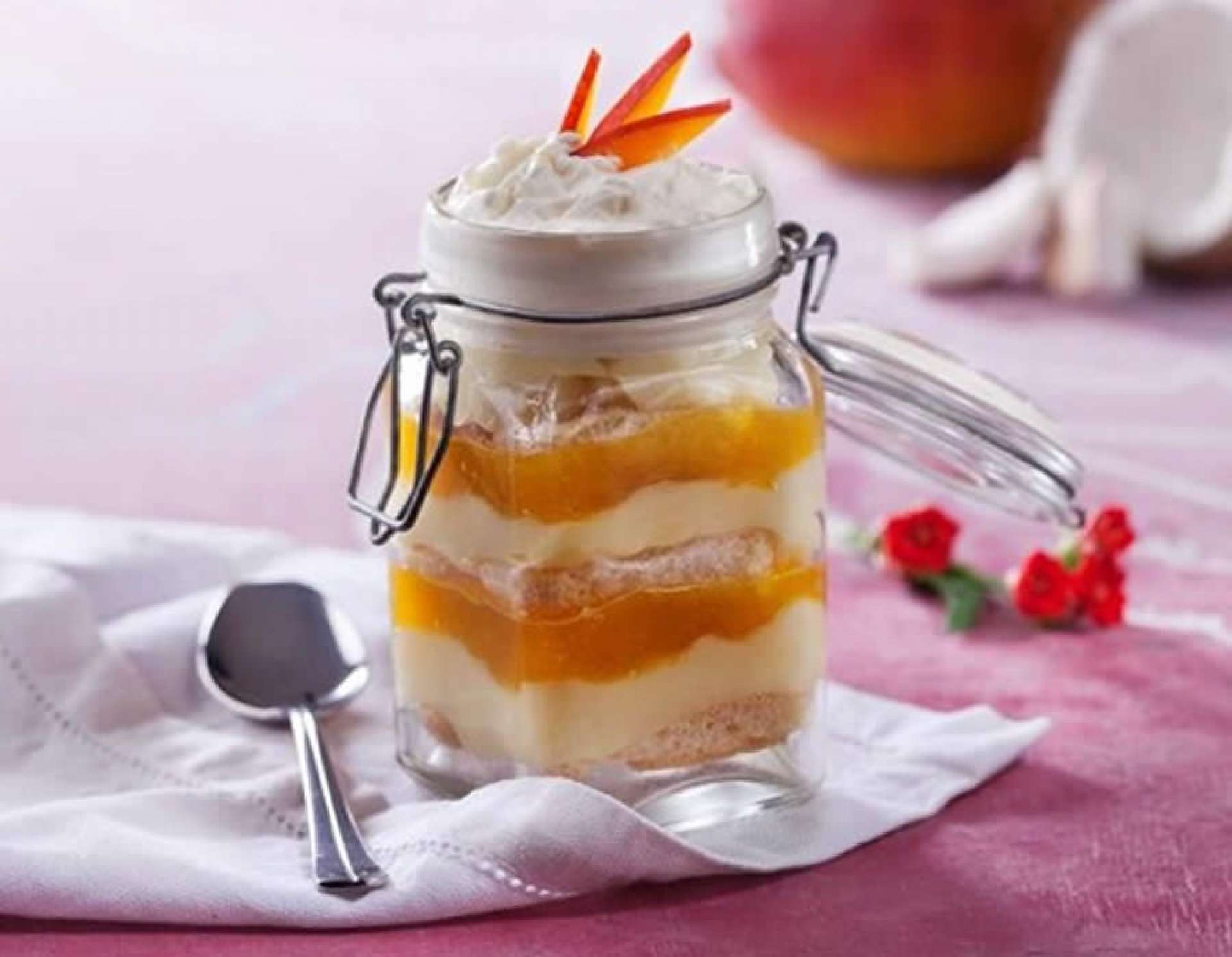 8) Em taças, intercale camadas de biscoito, creme de coco e geleia de manga, repetindo a operação para formar outras camadas. Decore com o chantilly, a fita de coco e as lâminas de manga. Mantenha na geladeira até o momento de servir.
