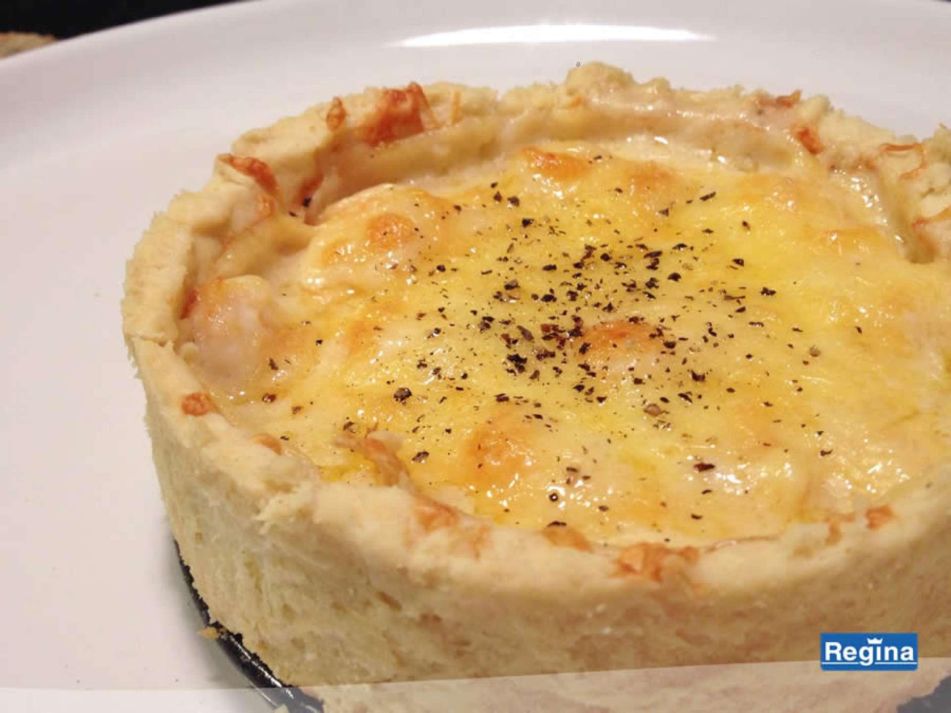 Faça furinhos com o garfo para a massa não inflar. Se quiser uma garantia, ainda maior, uma dica: antes de levar ao forno para pré-assar, cubra a massa, já na forma, com uma folha de papel manteiga e coloque feijões por cima. Eles formarão um peso e a massa não quebrará. Mas atenção: estes feijões não poderão ser utilizados depois. Leve ao forno por cerca de 20 minutos, até a massa ficar dourada. Enquanto a nossa massa está pré-assando no forno médio, prepare o recheio. Comece refogando a cebola na manteiga. Quando estiver dourada, coloque o alho. Em seguida, os camarões limpos. Se quiser dar um toque, coloque 1/2 taça de vinho branco seco neste momento da receita. Agora, é hora de acrescentar o requeijão Regina. Mexa bem até que o requeijão Regina se incorpore à mistura.