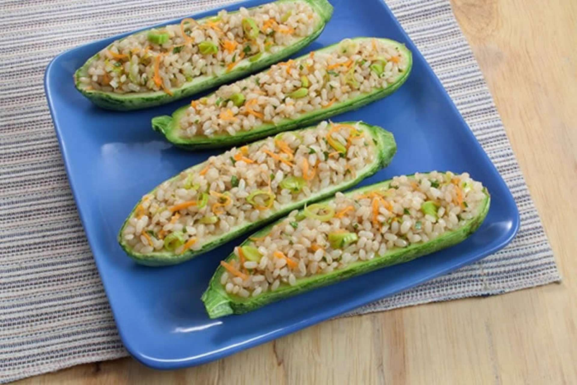 5- Recheie cada metade das abobrinhas com essa mistura e coloque em uma assadeira média (33 x 23 cm).
