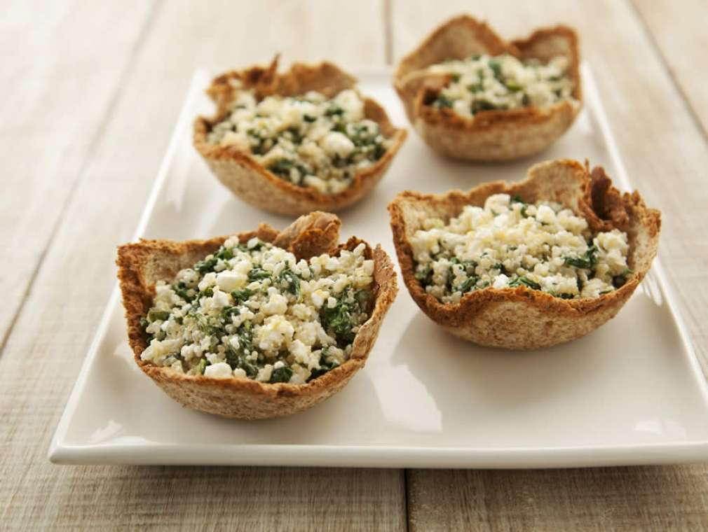 Desenforme as cestinhas de pão e disponha sobre elas o recheio de espinafre, cottage e quinoa.