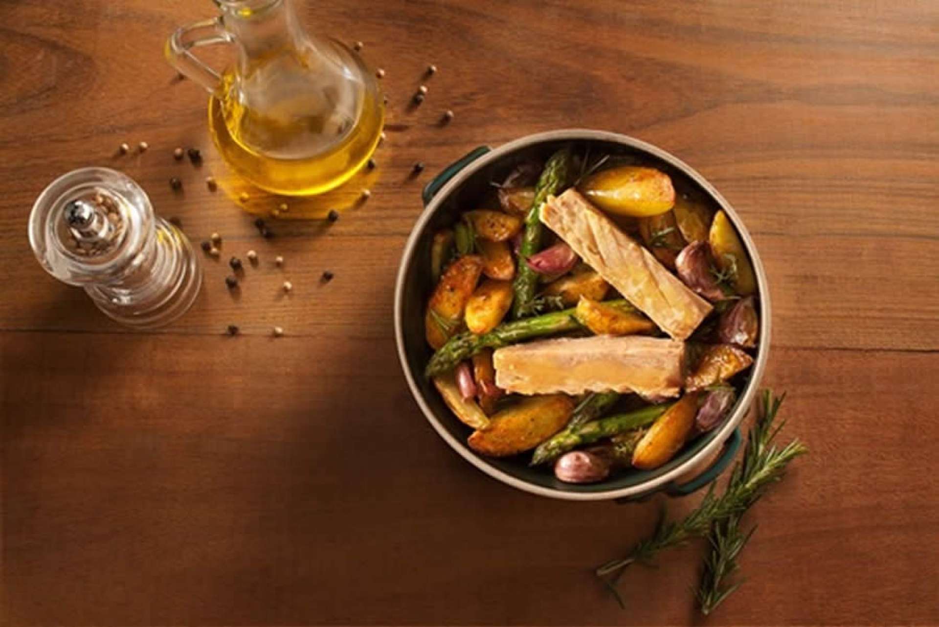 5. Retire do forno, acrescente os Filés de Atum em Azeite Extra Virgem COQUEIRO, regue com azeite e adicione o alecrim.
