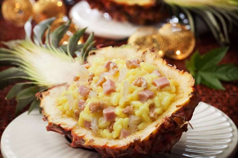 Em uma panela, aqueça a manteiga, em fogo médio, refogue a cebola até dourar levemente. Acrescente o Arroz Culinária Italiana CAMIL. junte o vinho e cozinhe, mexendo de vez em quando, até evaporar o álcool.3- Adicione o sal, o açafrão e o caldo de legumes fervente, aos poucos, mexendo depois de cada adição.Espere até que o caldo seja completamente absorvido antes de adicionar mais caldo.Quando o arroz já estiver cozido, desligue o fogo, acrescente a manteiga gelada e o queijo parmesão e misture. Adicione o tender, as nozes e o abacaxi, e misture delicadamente. Sirva a seguir.