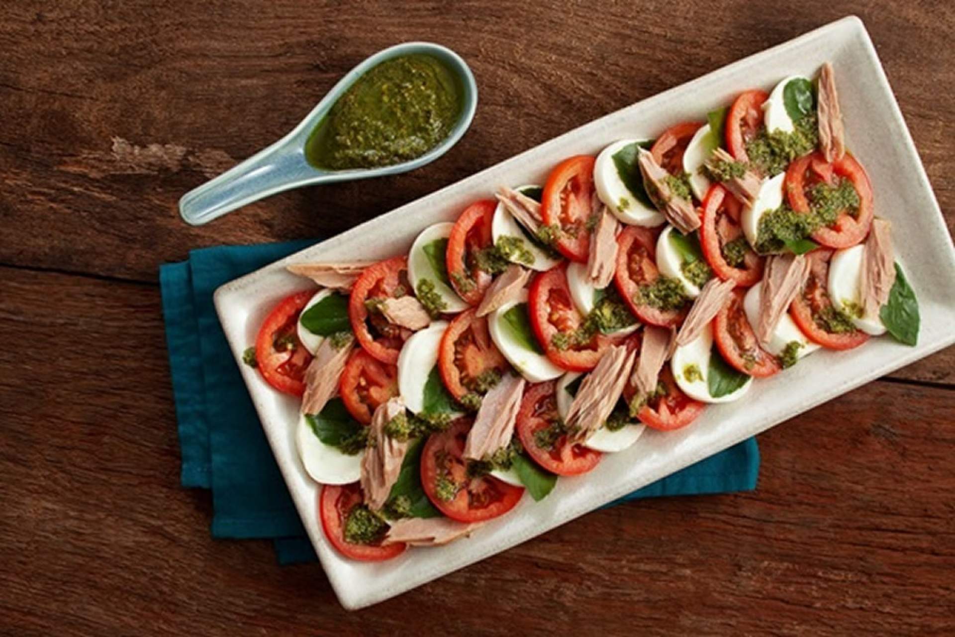 2- Em uma travessa, faça fileiras intercalando as rodelas de tomates, a muçarela de búfala, o manjericão e o Filé de Atum em Azeite Extra Virgem COQUEIRO.