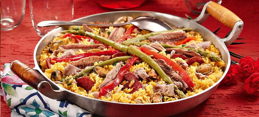 · Antes do arroz secar completamente, enfeite a superfície com tiras de pimentão, os Aspargos Gomes da Costa, os Mexilhões e os Filés de Sardinha. Tampe a paella com papel alumínio para descansar uns 10 minutos antes de servir.