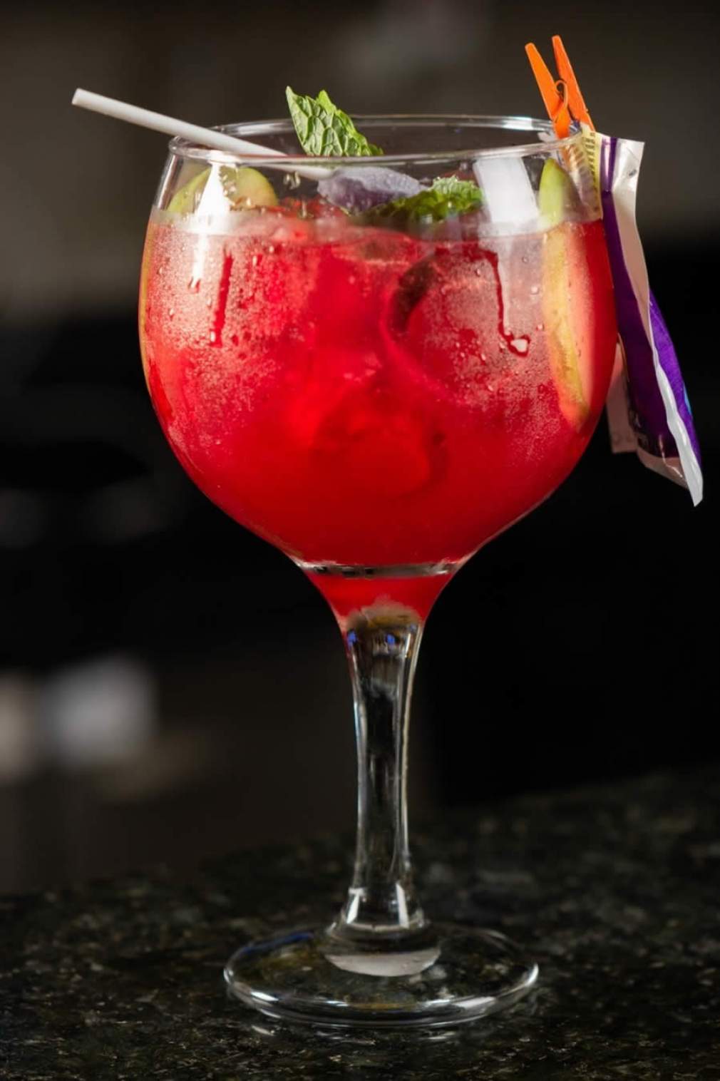 Coloque os ingredientes primeiro, depois o gelo e por último guarnição (pirulito, hortelã e duas bandas de maçã).