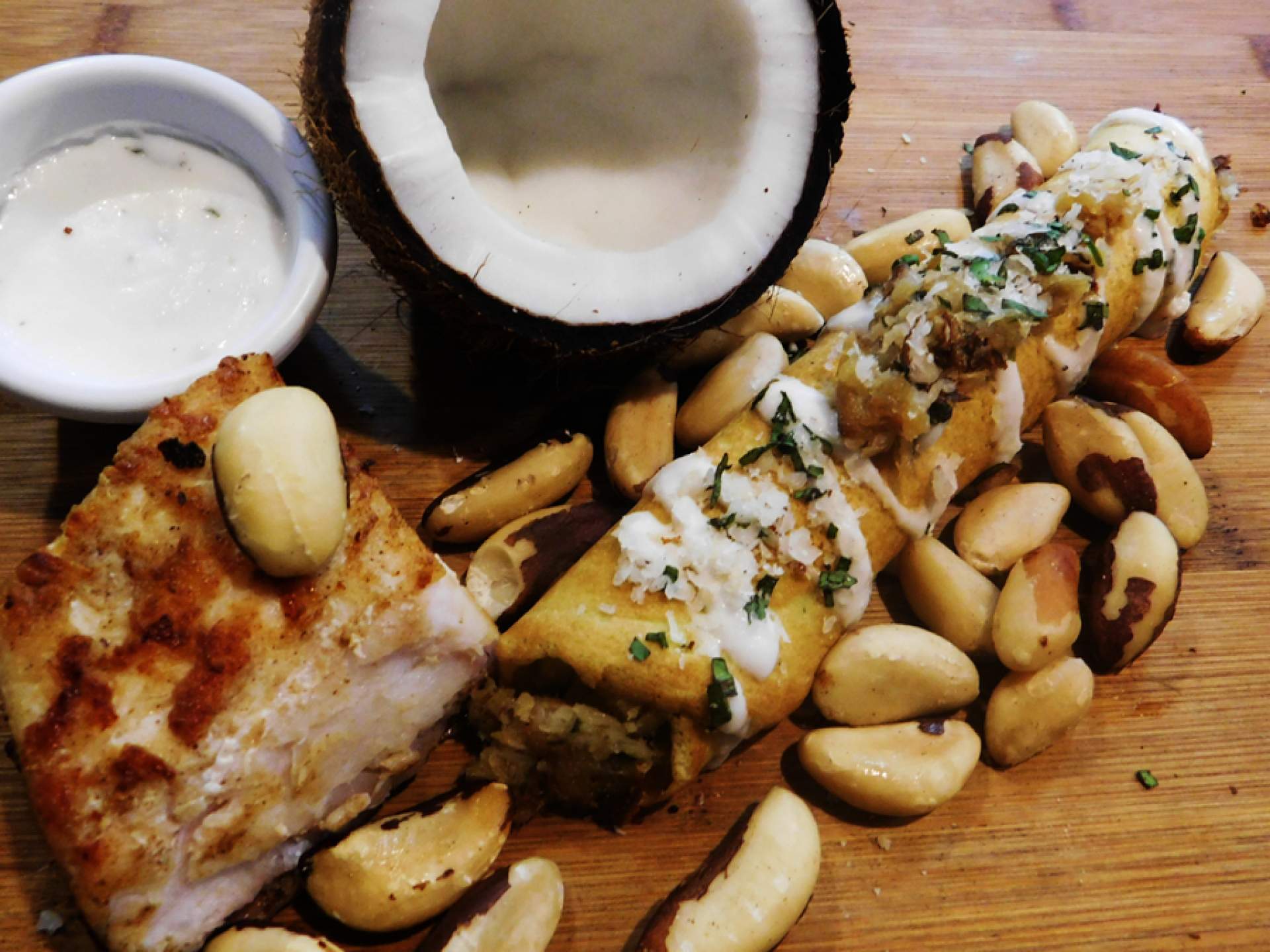 Coloque a crepioca aberta em um prato, adicione o peixe pirarucu desfiado. Em seguida, regue com creme de coco, salpique castanhas do Pará raladas, e enrole a massa. Enfeite creme de coco, castanhas do Pará raladas.