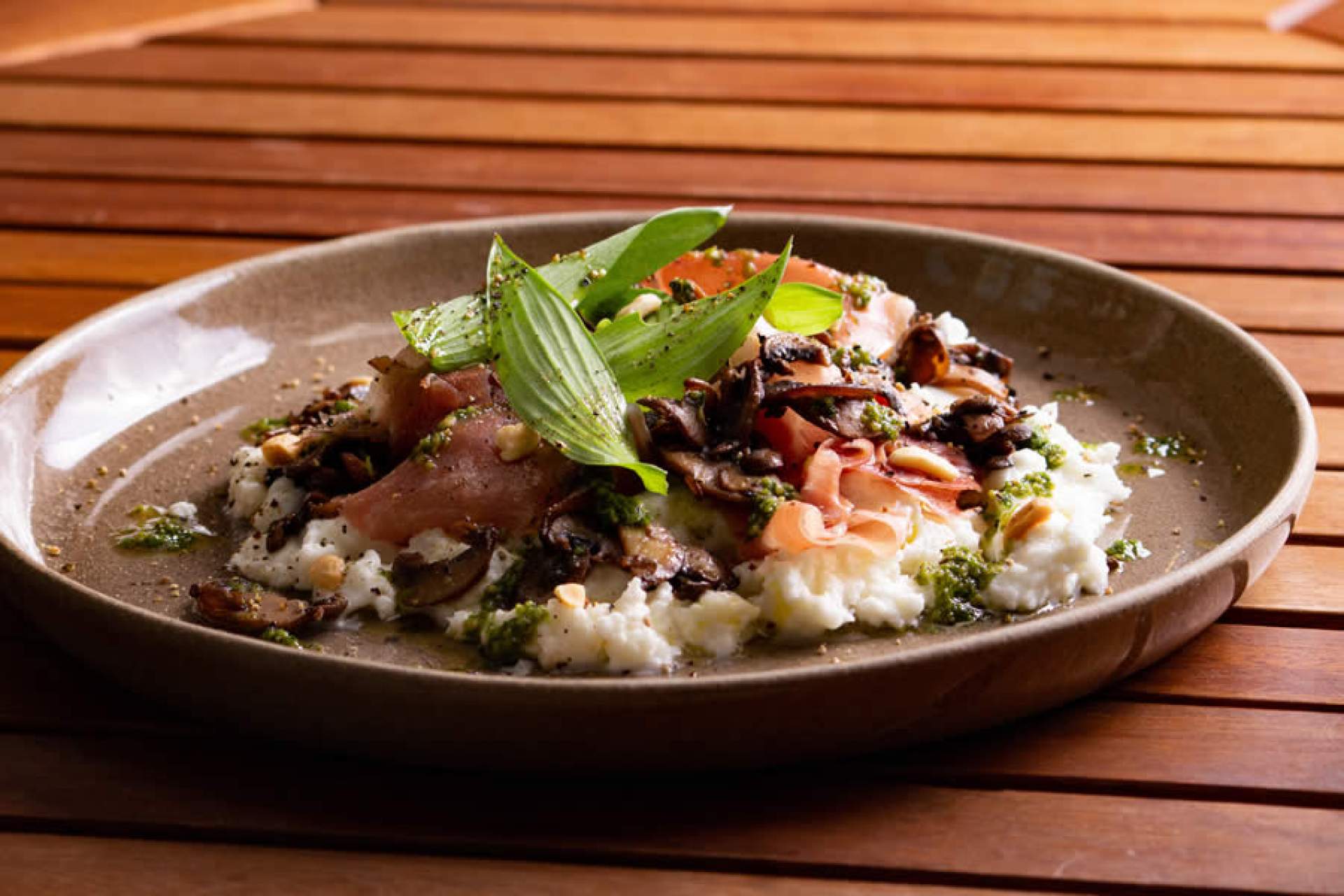 Faça um pesto com manjericão, nozes, grana padano ralado e o azeite de oliva, e, reserve em uma vasilha. Amasse a mozzarella de bufala com um garfo, rasgue o presunto cru por cima da mozzarella e regue com o pesto de manjericão por cima. Em uma frigideira salteie os cogumelos na manteiga, tempere com sal e pimenta e distribua por cima da porção. Aqueça o forno e doure os pinoles, em seguida distribua sobre os cogumelos. A receita pode ser servida com torradas.