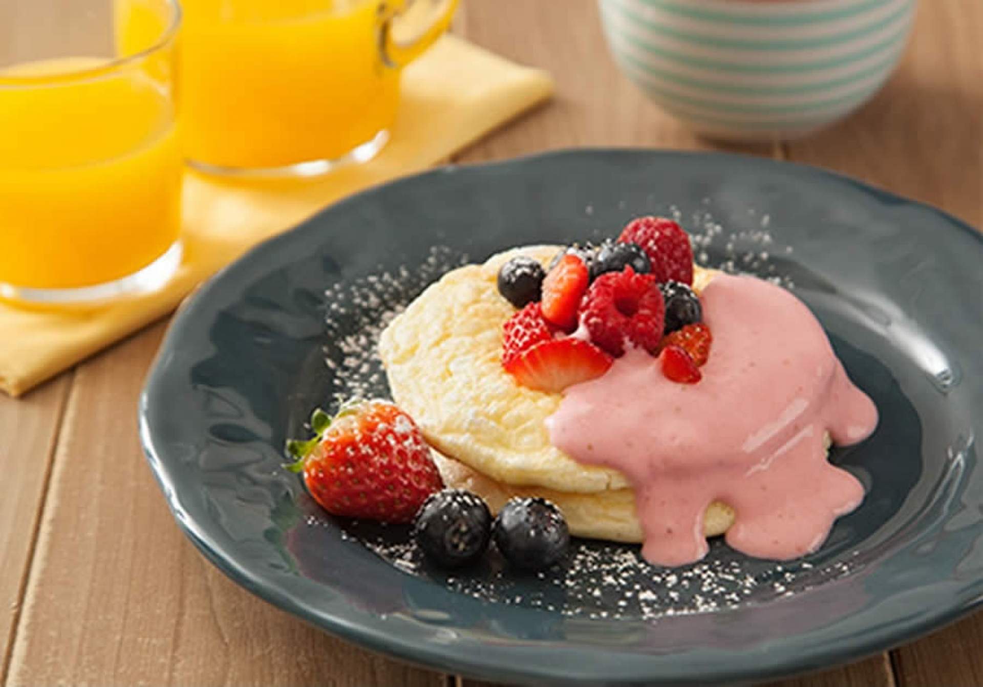 Para a montagem: Coloque os discos em um prato e por cima as frutas picadas e um pouco do creme de Queijo Cottage com morangos.
