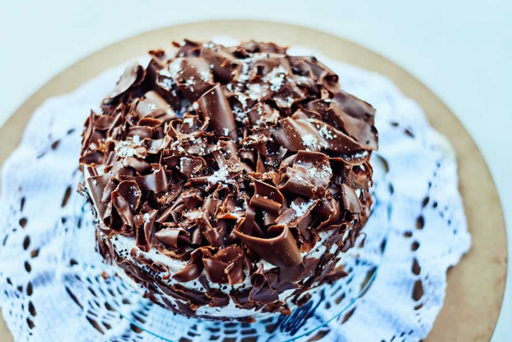 Desenforme o bolo e, depois de frio, o corte ao meio. Regue as partes da massa com a calda produzida e depois espalhe o recheio. Com o bolo estruturado, cubra toda a superfície com uma fina camada de chantilly. Finalize com raspas de chocolate ao leite ou granulado de chocolate, de forma aleatória.