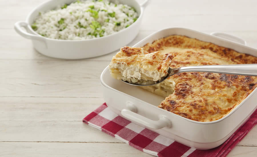 - Cubra as batatas e a cebola com a mistura a base do Creme de Ricota e polvilhe o Queijo Parmesão por cima. Leve ao forno para gratinar por aproximadamente 20 minutos ou até dourar. Sirva em seguida!