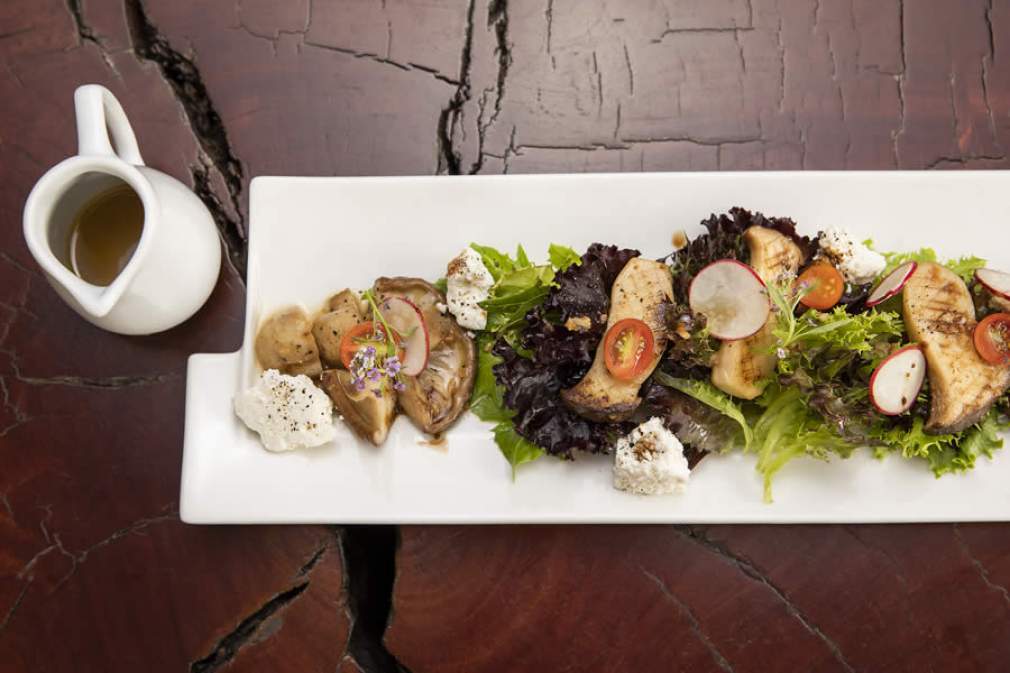 SALADA DE FOLHAS COM COGUMELOS E QUEIJO CHÉVRE