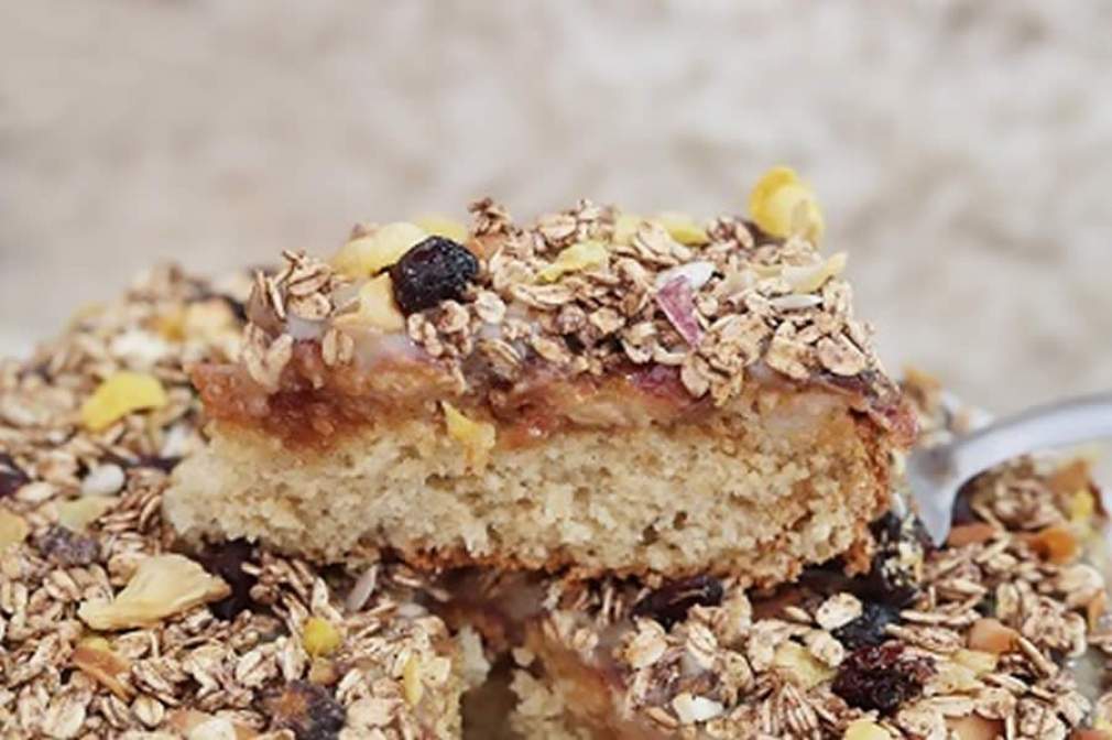 Reunindo ingredientes como banana, caramelo e Muesli vegano, o bolo tem sabor suave e, ainda, uma leve crocância. Vale a pena conferir!
