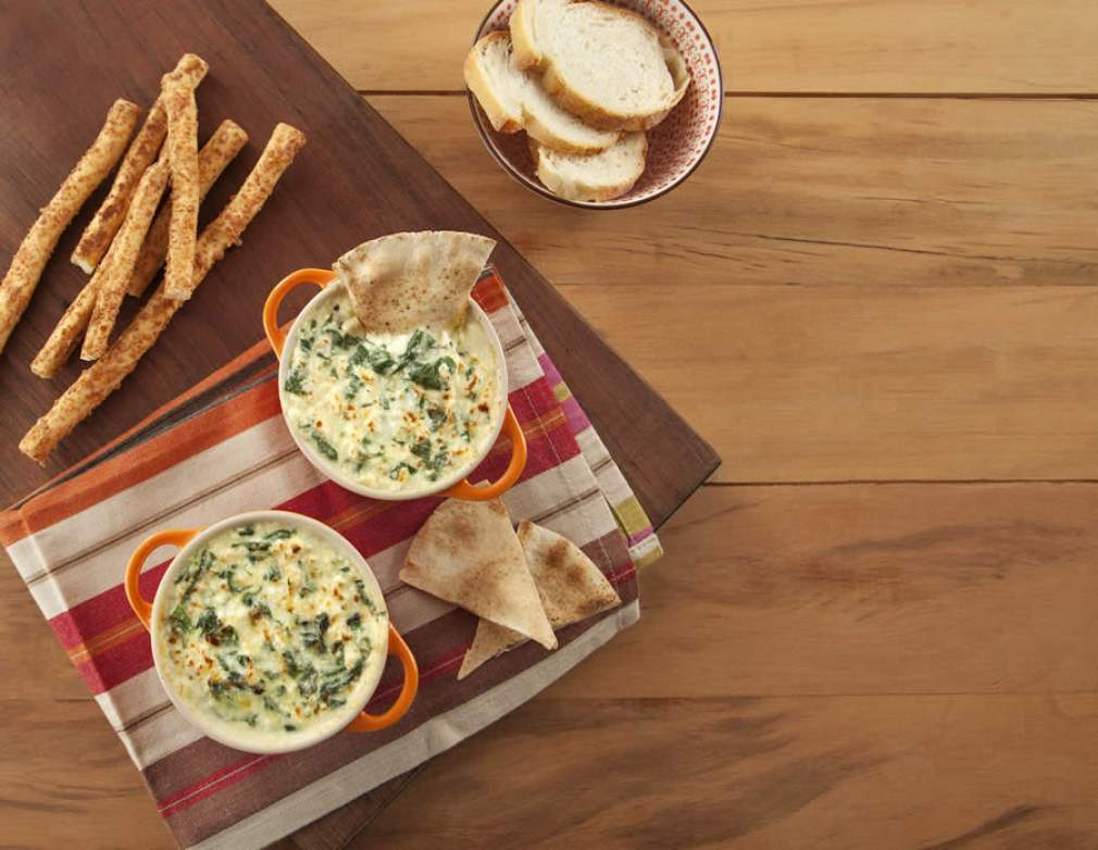 - Em um refratário, próprio para forno, coloque o creme de espinafre e salpique o parmesão; leve para gratinar em forno alto por, aproximadamente, 15 minutos. Sirva em seguida com o pão sírio torrado.