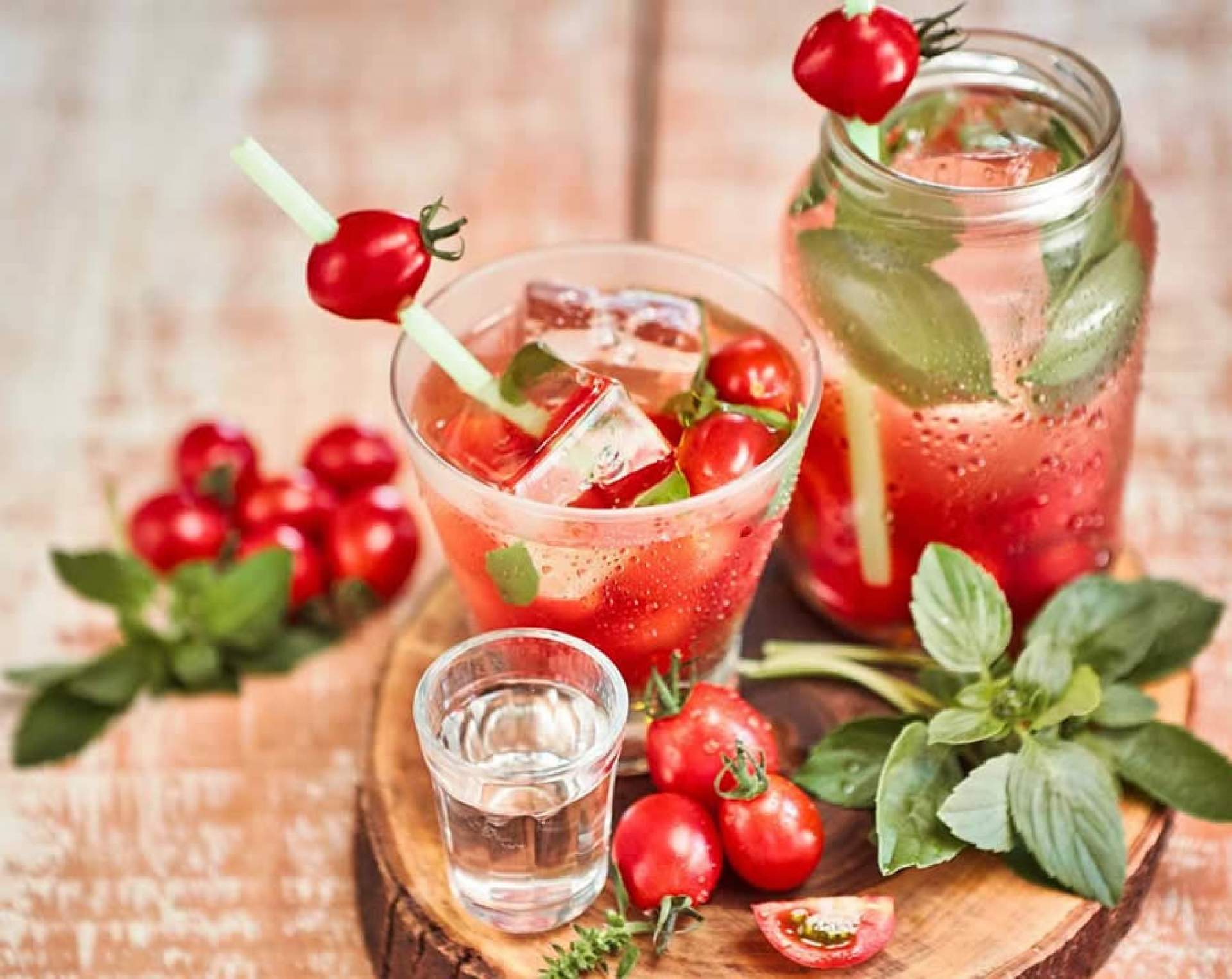 Mesmo se você não é lá muito fã do tomate, a combinação da fruta com bebida alcoólica fica deliciosa e não é de hoje que o tomate brilha nos drinks! Diga lá os amantes do bloody mary. O adocicado do tomate cereja harmoniza superbem com a cana de açúcar da cachaça e confere um sabor leve à bebida. Com a vodca a mistura fica mais encorpada e douceur da fruta traz a leveza que faltava. E aí? Vai testar? Uma dica: Fica lindo e descolado servir em vidros reaproveitados de conservas!